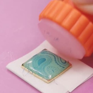 模様をつけたスタンパーを固まったレジンの表面につけて、模様をうつします。柄がはっきりとうつるように、レジンの端から転がすように1度だけつけましょう♪