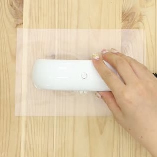 UVライトを押し花全体を覆うように当てて固めます。ピンの部分が液としっかりくっつくように、端から端までUVライトを当てましょう♪