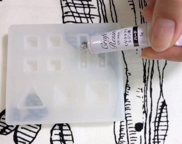UVレジンを型にそれぞれ流し入れたら、つまようじでまんべんなく広げます。型に液がしっかりと行き渡るようにしましょう。