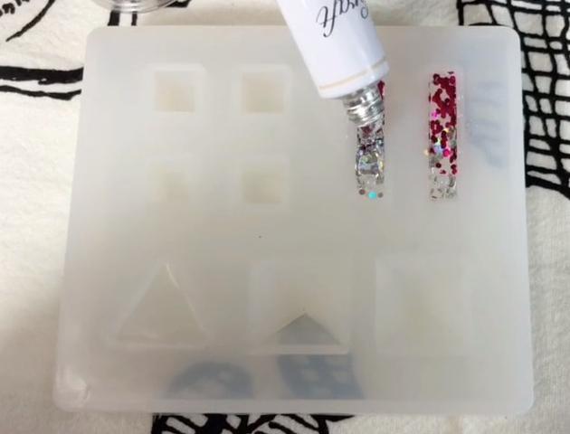 好きなカラーのラメを、手順1で注ぎ込んだレジン液の上に乗せましょう。動画では、ピンクとシルバーのラメを半分に分けて乗せています。お好みでアレンジできるのが楽しいですよね♡