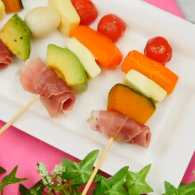 7.マリネした野菜、生ハム、チーズを串にさしたら完成!