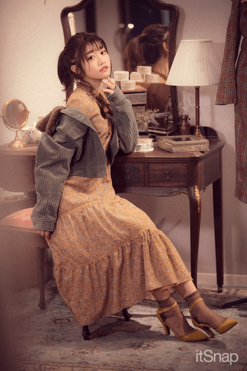 ちょうどいいバランスのフリルと、白っぽいカラーがかわいさを最大限に引き出してくれます。小物の合わせ方でこなれてみせることもできるんです!
