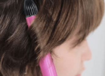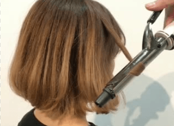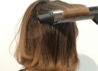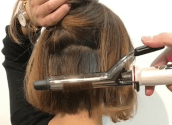 26ミリのコテを180度に温め、サイドの髪を二段にブロッキングします。下の髪を外巻きに、上の髪を内巻きに巻いてください。