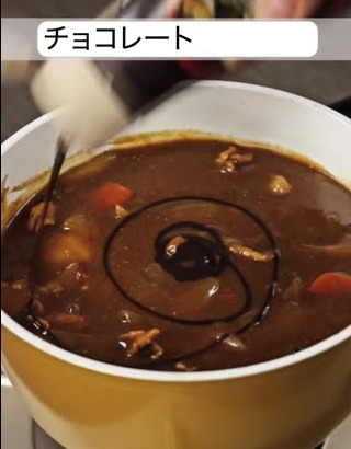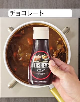 板チョコをパキパキ割って入れて溶かすのもアリですが、チョコレートソースの方がお手軽なのでオススメです。お鍋いっぱいのカレーに、ぐるぐるを描くようにしてソースを追加しましょう。しっかりまぜたら出来上がり!コクと甘みが格段にアップしたカレーを召し上がれ♡