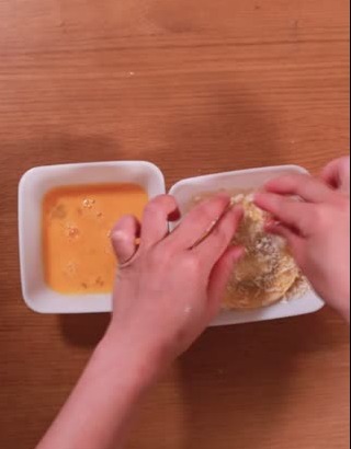 溶き卵、パン粉の順にそれぞれ両面にたっぷりつけます。
