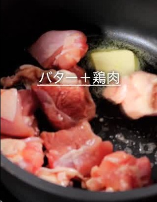 熱したフライパンでバターと鶏肉を炒めます。2つがしっかり絡み合うよう、よく混ぜ合わせてくださいね。