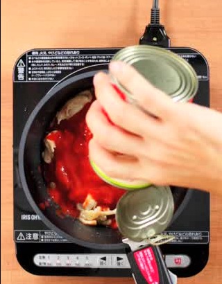 鶏肉に火が通ってきたら、トマト缶を全部入れます。続いてお水も入れましょう。お水の量は空いたトマト缶1杯分です。