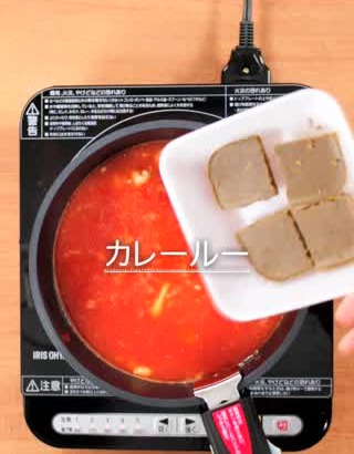 鍋の中身がふつふつしてきたら弱火にし、カレールーを入れてよく混ぜましょう。