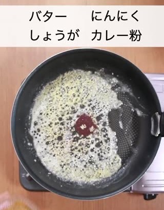 フライパンにバターを熱し、にんにくと生姜のみじん切りを炒めます。続いてカレー粉を加え、さらに炒めましょう。