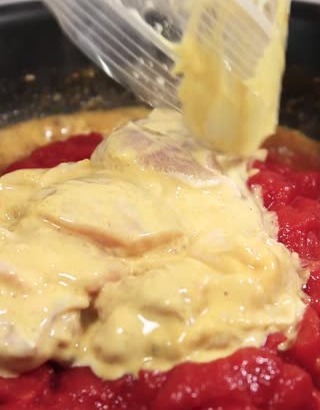 トマト缶とはちみつと下準備しておいた鶏もも肉を加えます。そのまま蓋をして弱火でコトコト20分煮込みます。