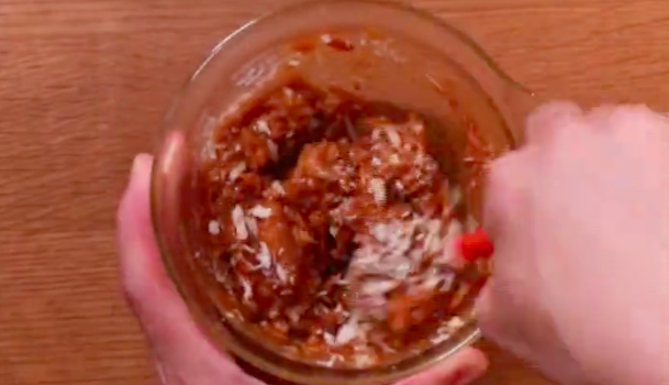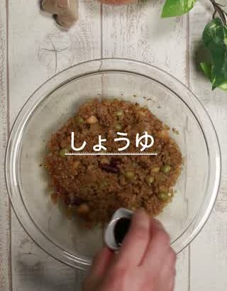 手順1のボウルに材料Bを加えよく混ぜ合わせましょう。再びラップをかけてレンジに6分かけます。