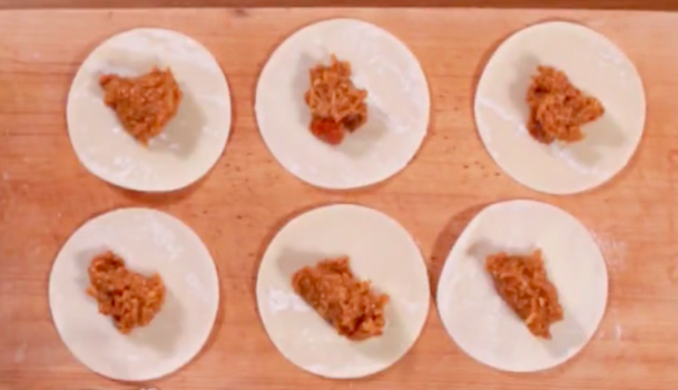 手順1を餃子の皮に適量盛ります。ただし、2枚で挟み込める量にとどめて!あまりにも盛りすぎるとはみ出してしまい、焼くのが大変になってしまいます……