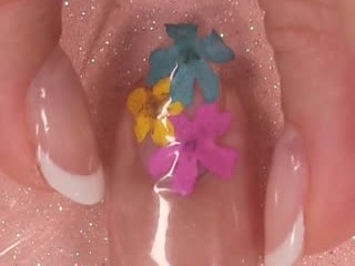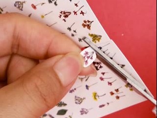 爪にベースコートを塗ったら、その上から押し花をのせていきます。