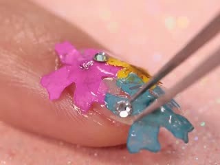 押し花が爪にしっかりと密着するように、ビニールやラップをつかって押し花をのせた上から押さえつけていきます。