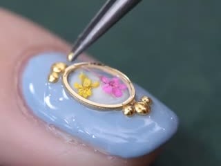 丸いパーツを額縁とみたてて、真ん中に押し花を閉じ込める一工夫をこらしたセルフネイルデザインです。簡単なのに凝っているように見えるデザインなので、とってもおすすめですよ♡