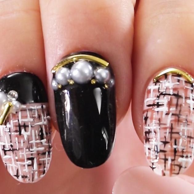 ツイードネイルは温かみさも取り入れられるネイル。冬に人気のツイード柄のスカートやジャケットと合わせても♡