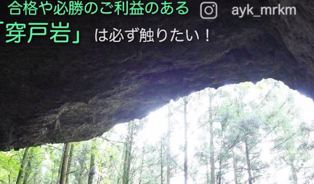 岩山の中に空いた大穴、通称「穿戸岩(うげといわ)」は、合格や必勝などのご利益があるパワースポットと言い伝えられています。ぜひ岩を触ってご利益をあやかりたいですよね。