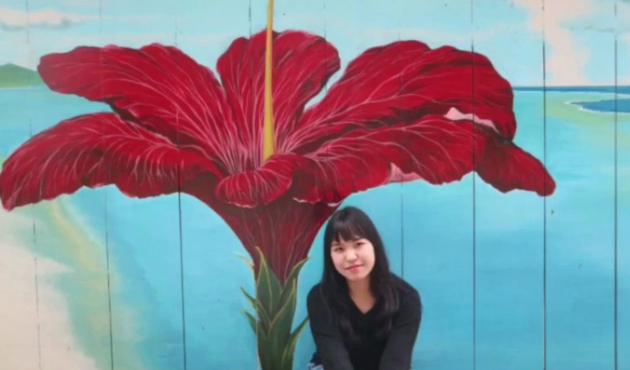 大きな壁にハイビスカスやフルーツが書いてあって、インスタ映えも狙えそうなこちらのフォトスポット。ビビッドな壁紙がかわいい!