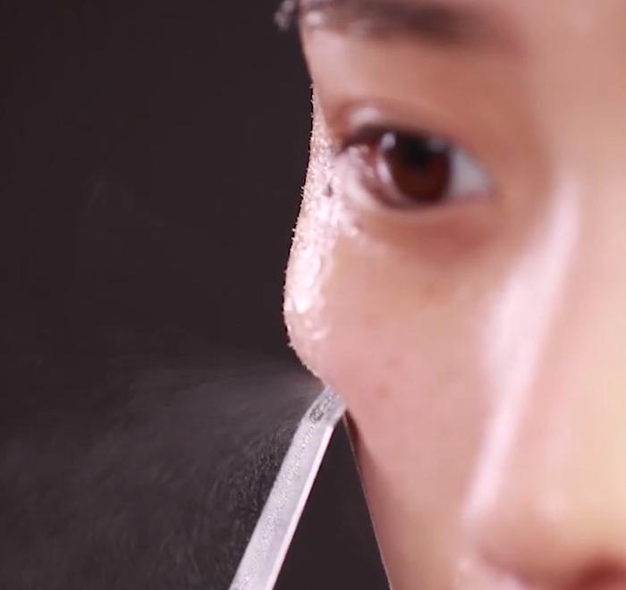 目の下からこめかみに、そのあと頬骨のくぼみからこめかみにかけてリンパを流しましょう。頬を引き上げるように!