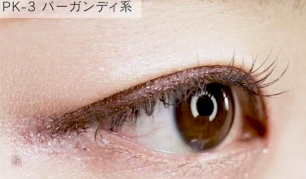 「PK-3 バーガンディ系」は、大人なバーガンディ。紫みが少なく、ブラウンに近い発色なので肌なじみもいいですよ。ベージュの上にバーガンディを重ねると腫れぼったくならず◎