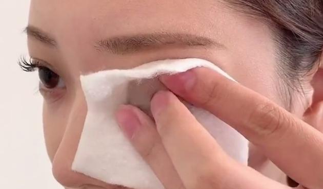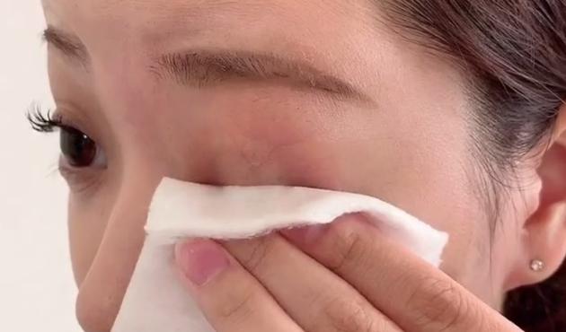 次にポイントオフ用のメイク落としをコットンにたっぷりと含ませて、まぶたに数秒押し当てます。強く押し付けずに、優しくまぶたに押し当ててましょう。
