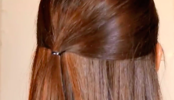 髪をハーフアップにして、お花のアレンジを作りたい部分をヘアゴムで留めます。中央でもできますが、サイドに結び目を寄せて作ると大人っぽく仕上がりますよ♪