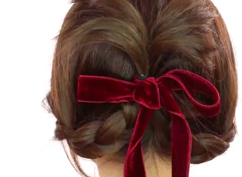ふたつの三つ編みのそれぞれの結び目をリボンの位置まであげ、リボンで結びます。ちょうちょ結びにしたら、完成♪