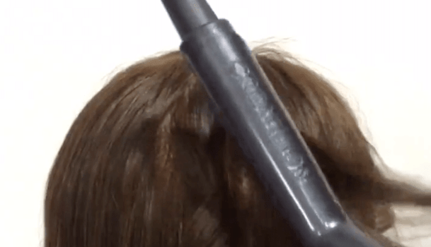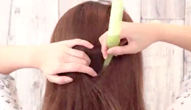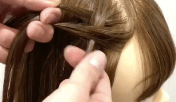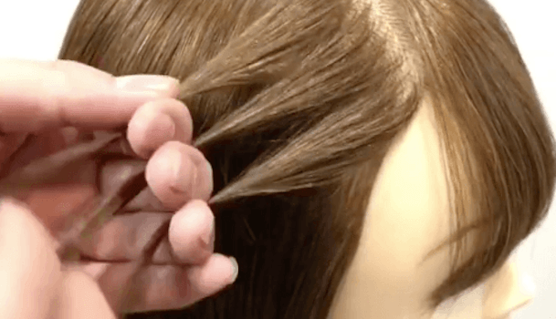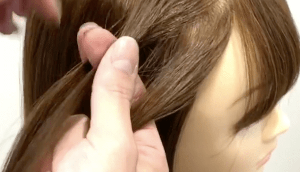 先ほど毛束をクロスさせたので、動画の場合はもともと左にあった束が真ん中にきていますよね。