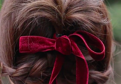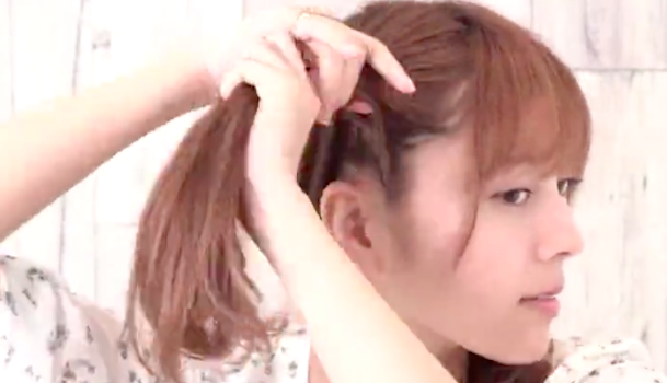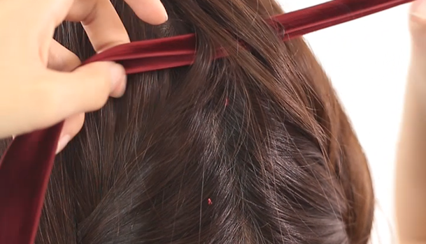耳の後ろあたりの位置で、髪の根元にりぼんをくぐらせ一つ結びにします。