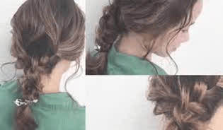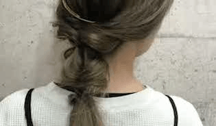 手順1でロープ編みをした左右の毛束を、後ろでさらに2回ねじって結びます。コツは、きつめに結ぶことです!