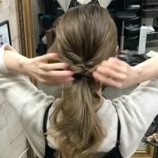サイドに残しておいた毛を手順2の毛束の上で結び、くるりんぱをします。くるりんぱをしたら、先ほどと同じように毛を引き出して華やかに◎