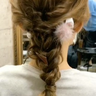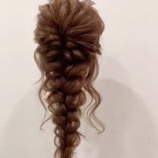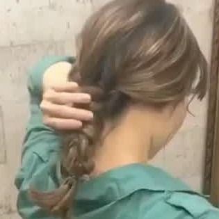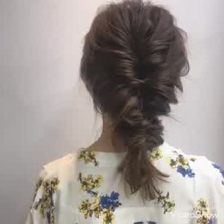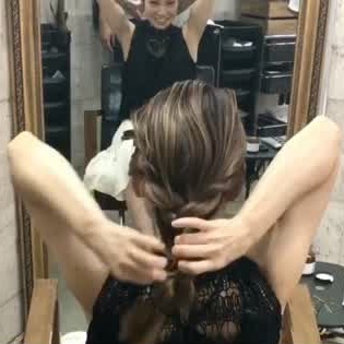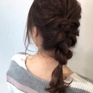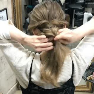 三つ編みをした左右の毛束を後ろで1つにねじり、ゴムで留めましょう。編んだところを引き出せば、完成です♪