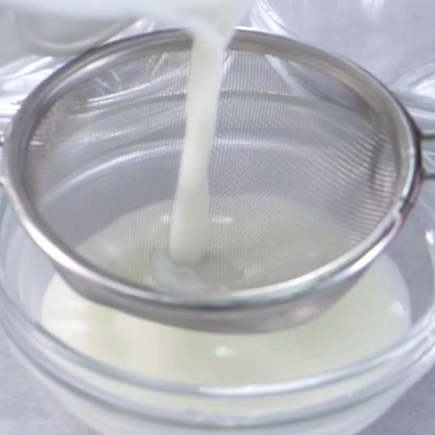 牛乳・砂糖・ふやかしたゼラチンを温めながら混ぜ合わせます。混ざったら、ザルでこしながら3つのボウルに移してください。