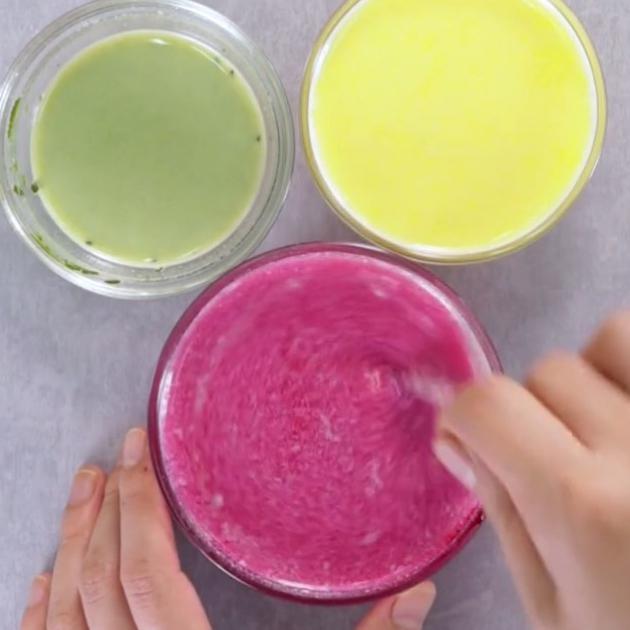 手順2で作った3つのボウルにそれぞれ抹茶・いちごピューレ・オレンジジュースを入れてください。これがあとで花びらへと変化していきます。