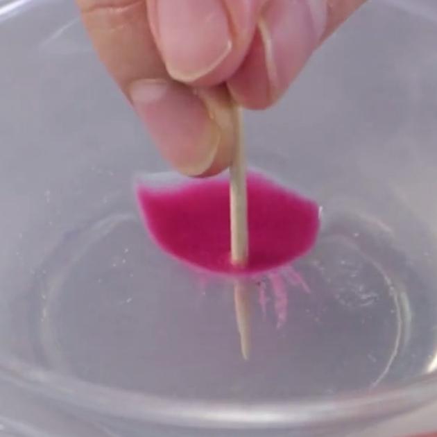 手順4で流し込んだ液に爪楊枝をさしてお花の中心を作っていきます。あまった液はスプーンで取り除きましょう。