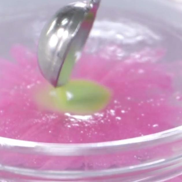 くりぬいた穴に手順3で作った液を流し込み、冷蔵庫で冷やしたら完成♡ぷるぷるっとしたお花のゼリーのできあがりです。
