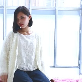 綺麗な黒髪ボブにコントラストされるデザインのスカーフで、髪の毛に立体感が出ます。