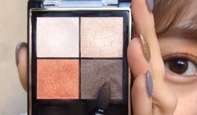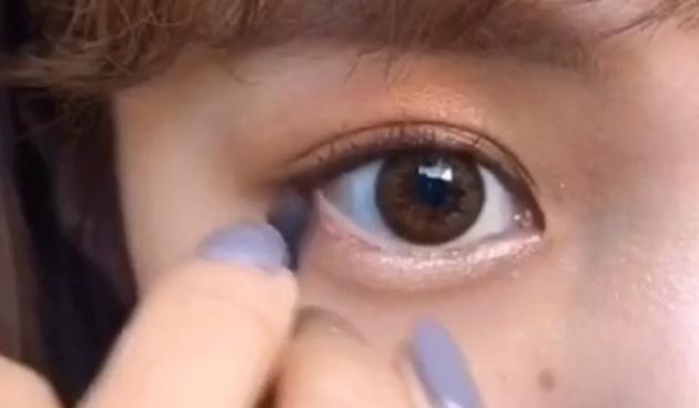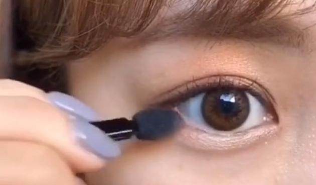 次に手順3・4で使ったアイシャドウの濃いブラウン部分を細いチップにとり、上まぶたと下まぶたのキワにのせていきましょう。これが締め色となります♪