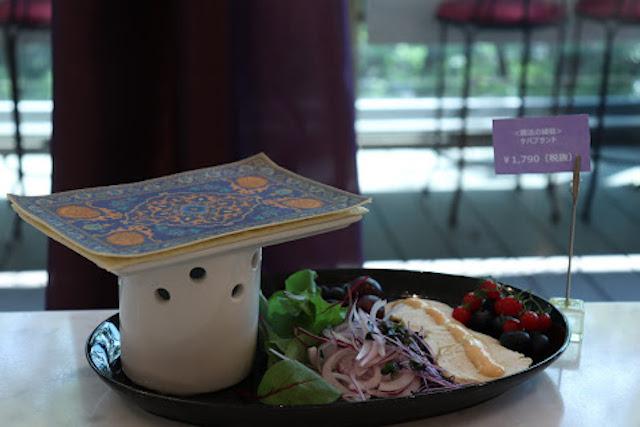 SNS映え!魔法の絨毯風の薄焼きパンに好きな具材を巻いて完成する、というまさに『アラジン』なメニュー。魔法の絨毯のリアルさに「食べるのがもったいたい!」という声も。驚くべきは絨毯の下。なんと!煙がもくもくと出てくる驚きの仕掛けが!!!