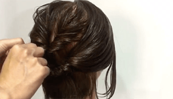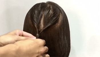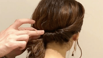 えりあしの毛を半分にわけます。わけた片方の髪の毛を結び目にねじりながら巻きつけ、ピンでとめます。