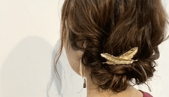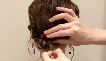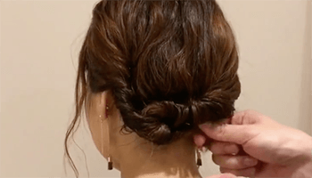 もう片方のえりあしの毛を、同じように結び目に巻きつけるようにねじりながらピンでとめます。バランスを調整したら完成です♡
