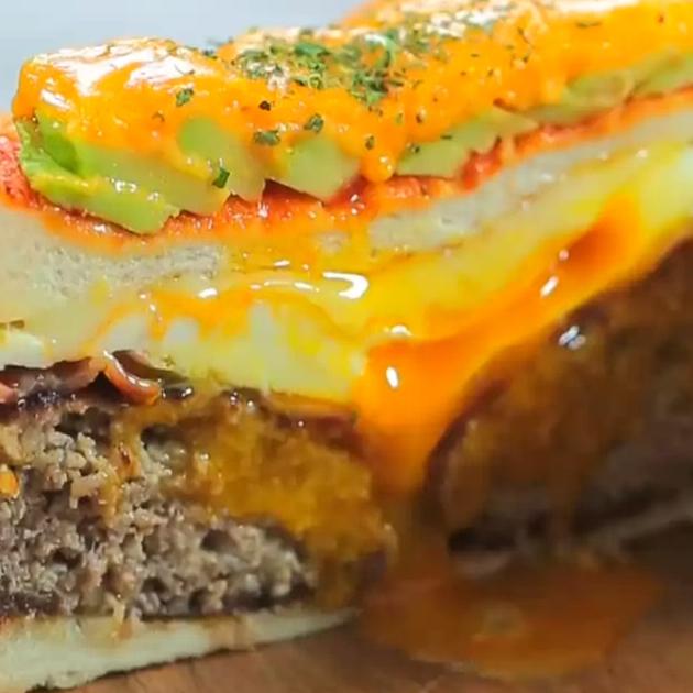 ハンバーグ×チーズ×アボカド×ベーコンエッグ×トーストのボリュームたっぷり!なサンドイッチレシピ。ハンバーグを作ればあとはのせて焼くだけなので、意外と簡単ですよ。