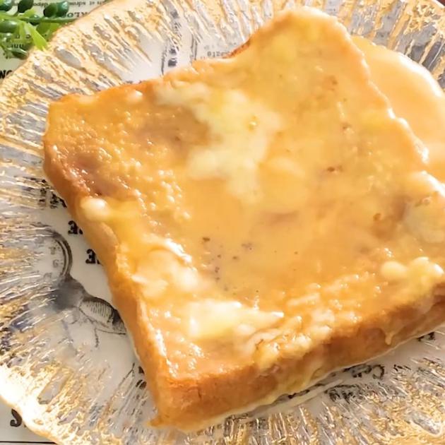 チーズとプリンをトーストにのせて焼いた絶品朝ごはん。甘党さんにはたまらないレシピです!