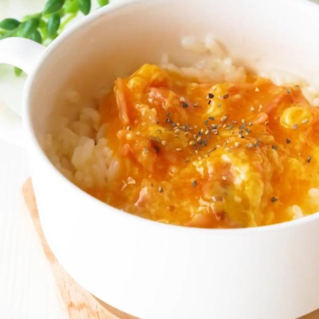 1.ご飯・ケチャップ・コンソメ・ベーコンの順に加えて500Wのレンジで1分加熱