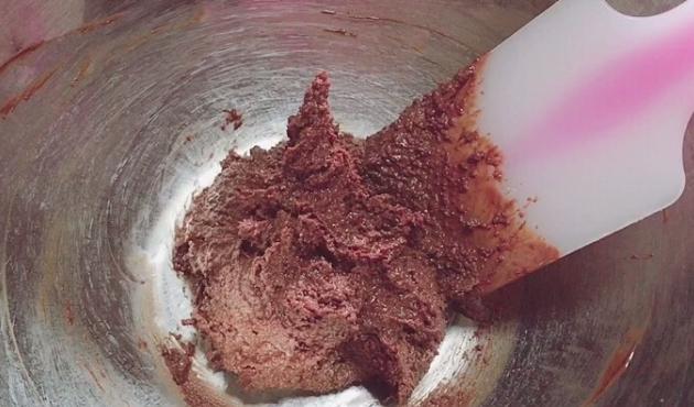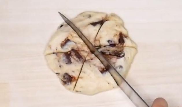 ざくざくと砕いた板チョコを生地に混ぜます。このとき、まんべんなくチョコが広がるように意識すると、出来上がりの見栄えが良くなりますよ♡