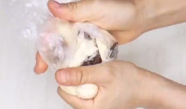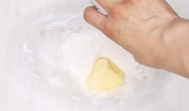 ポリ袋にホットケーキミックスとバターを入れ、袋の外からもんで中身を混ぜます。このとき、バターは常温に戻しておくといいでしょう。