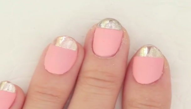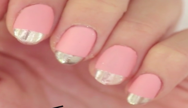 マスキングテープをはがし、ベースのダスティーピンクの部分にマットコートを塗ります。爪先のシルバーの部分には塗らなくてオーケー。また、ここで使用するマットコートも100均に売っているものを使います。塗り終わったら、出来上がり!上品な雰囲気のデザインなので、結婚式などの華やかな場にオススメです。