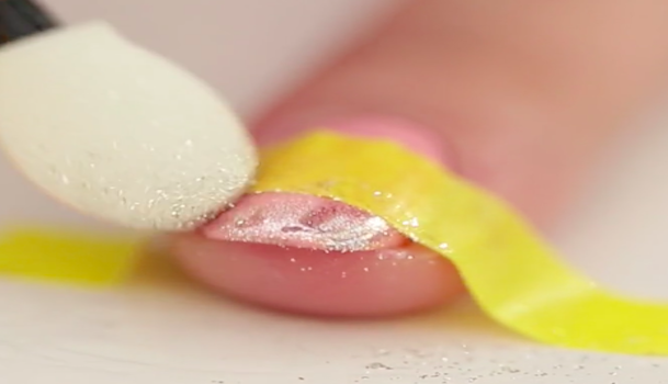 いよいよパウダーの登場です。今回はキャンドゥのメタリックシルバーを使用します。アイシャドウ用などのチップにとり、爪先をこするようにしてつけていきます。重ねて塗っていくうちに、なめらかな仕上がりになります。