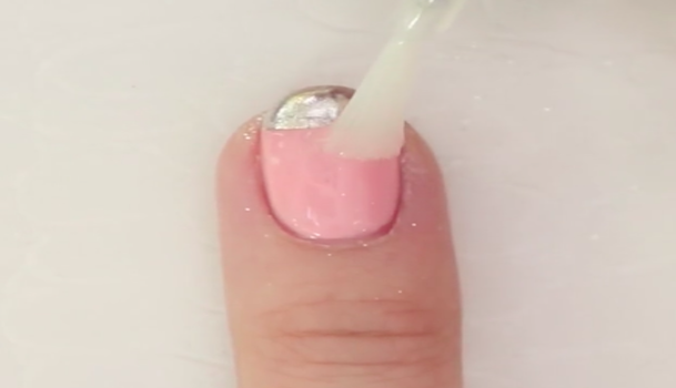 シルバーのパウダーがなじんだら、爪先にトップコートを塗ります。