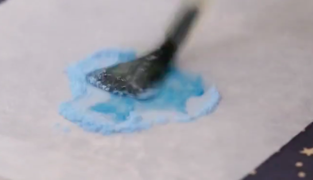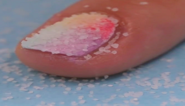 トップコートの上から、シュガーパウダーをふりかけます。今回使用するのはセリアのデコパーツシュガーパウダー。この時トップコートがノリ代わりとなるので、足りないようなら塗り重ねつつパウダーをかけていってください。